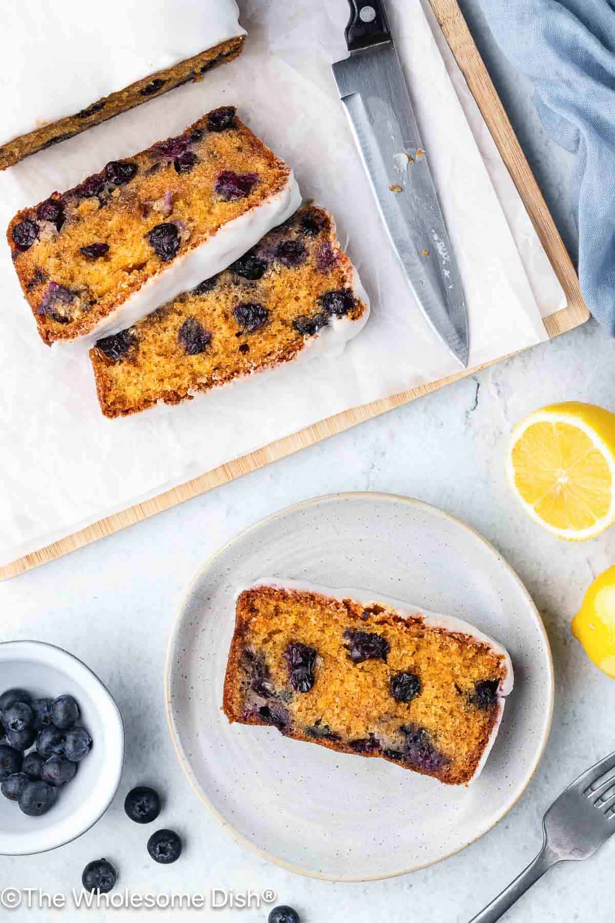 Three slices of lemon blueberry bread, one on a plate and two on a cutting board.