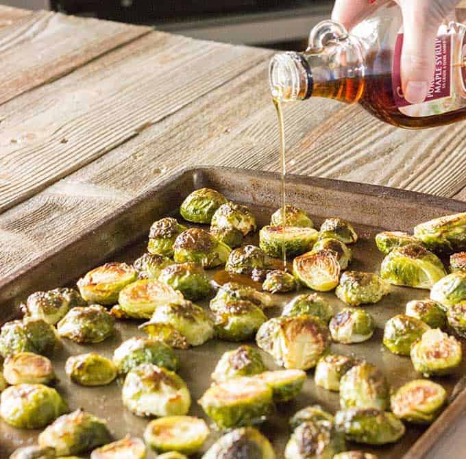 - Drizzle the maple syrup over the sprouts and stir to coat. Roast for 8-10 more minutes.