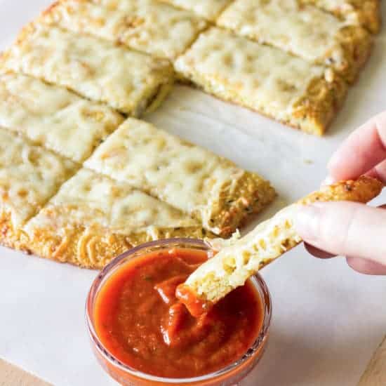 To make cheesy garlic bread, I added ½ cup shredded Italian-blend cheese to the crust.ย Then, served it with pizza sauce for dipping.