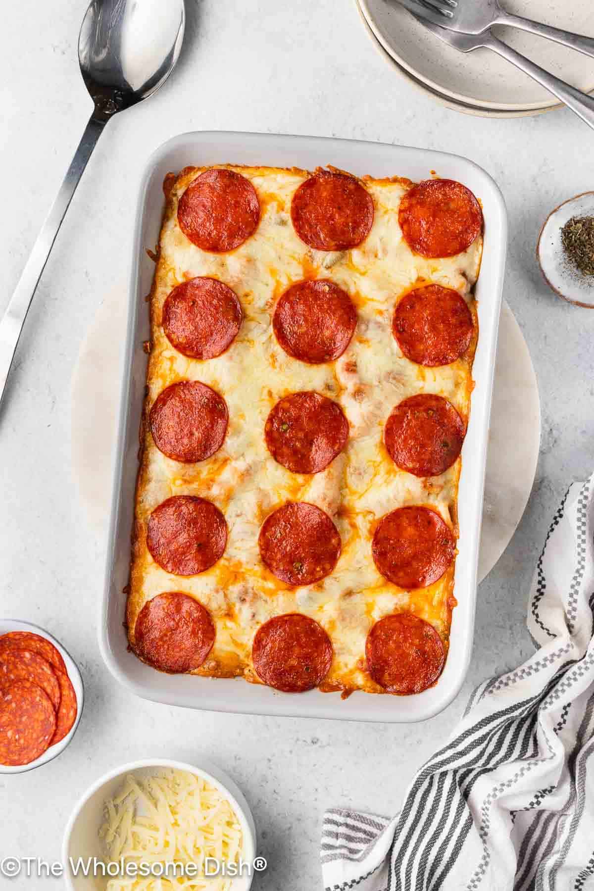 - Transfer the pasta to a 9×13" baking dish. Spread it out evenly. Sprinkle the shredded cheese evenly over the pasta. Spread the sliced pepperoni out evenly over the cheese.