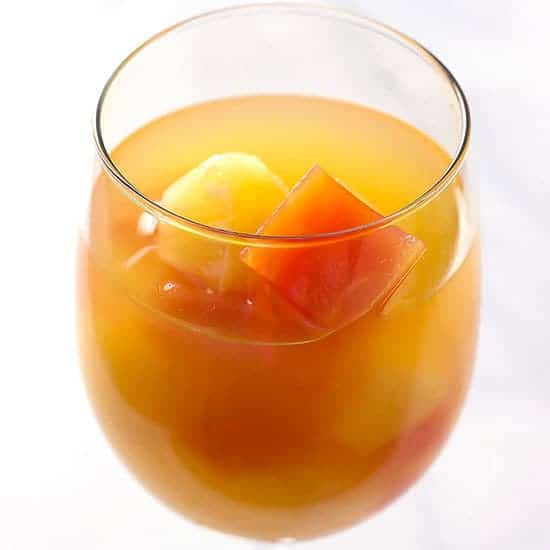 I love fresh tropical fruit, like mango and pineapple. ย But, they’re some of the most cumbersome fruits to chop up. ย Using some quality jarred tropical fruit in fruit juice makes this sangria quick, easy, and so good!